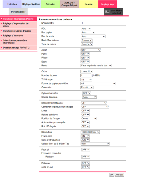 [Paramètre fonctions de base] | Effectue les réglages d'impression de base. Pour en savoir plus, voir Paramètre fonctions de base. |