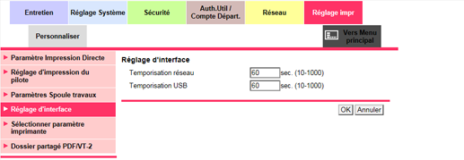 Entrez la valeur souhaitée dans la zone de texte [Temporisation réseau]. La plage disponible est comprise entre 10 et 1000 secondes.