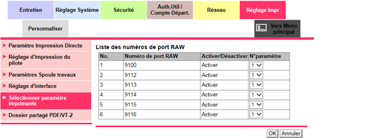 Cet écran vous permet d'attribuer les paramètres imprimante spécifiés dans [Paramètre Impression Directe] à chacun des six numéros de port RAW.