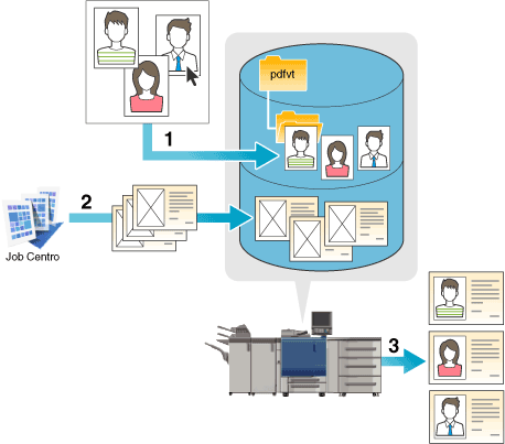 2 | Utilisez Job Centro pour importer les données d'un document PDF/VT-2, puis associez-les au chemin d'enregistrement des données source VDP pour envoyer la tâche.