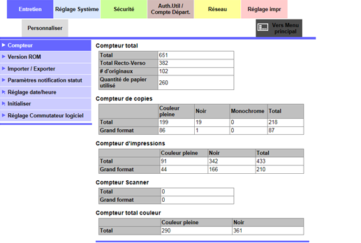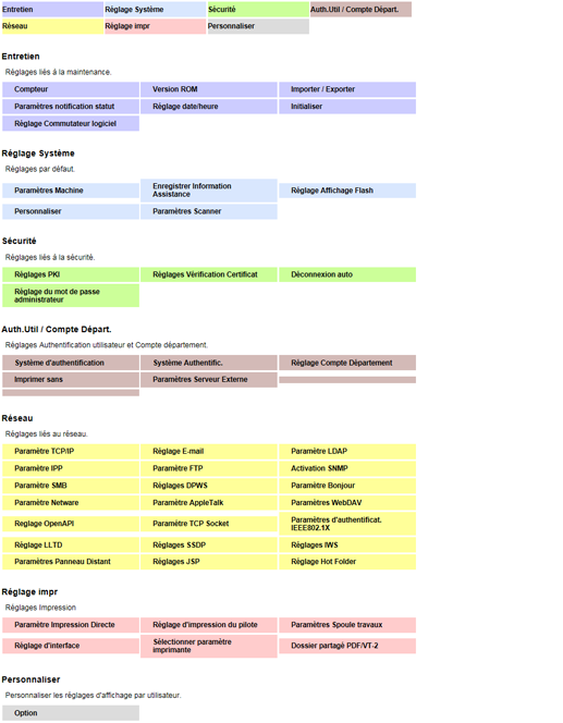 Lorsque vous cliquez sur l'onglet [Vers Menu principal], les articles de menu utilisables en mode utilisateur sont regroupés en un seul écran.