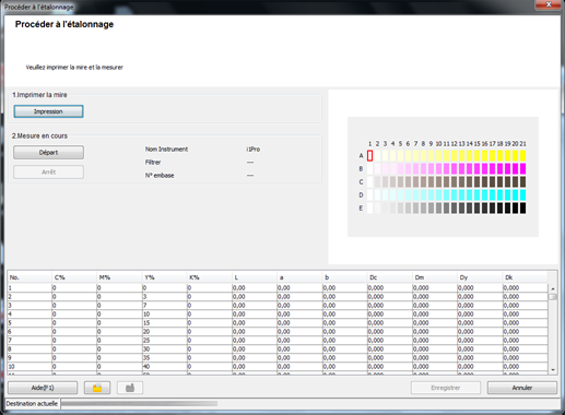 Cette section décrit comment imprimer une mire et la mesurer en utilisant le colorimètre sélectionné.