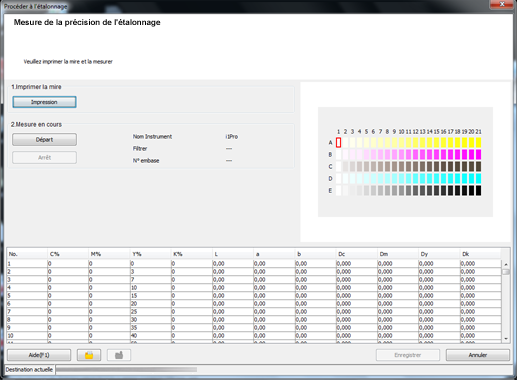 Cette section décrit comment mesurer la précision de l'étalonnage en imprimant la mire au moment de la répercussion des données d'étalonnage.