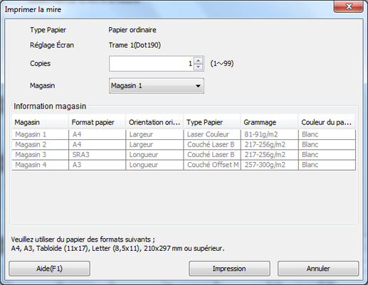 L'impression de la mire est exécutée. L'écran [Mesure de la précision de l'étalonnage] réapparaît à la fin de l'impression.