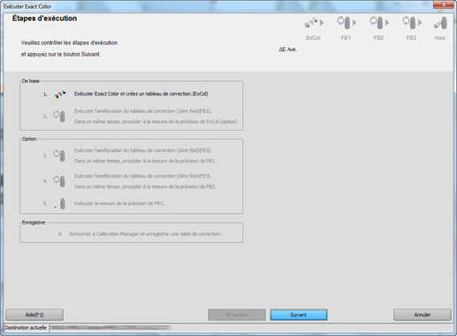 L'écran pour exécuter l'étalonnage avec Exact Color s'affiche. "FB" signifie "retour" et "FB1" désigne le premier retour.