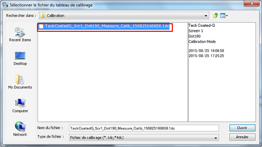 L'écran [Sélectionner le fichier du tableau de calibrage] s'affiche.