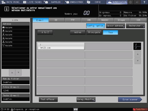 La liste des adresses e-mail est affichée par défaut. Pour en savoir plus sur l'onglet Destination par défaut de l'écran [NUMERISER], voir Configuration scanner : définition des valeurs par défaut des fonctions de numérisation.