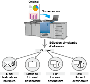 Si vous enregistrez plusieurs destinations en tant que groupe, vous pouvez y envoyer ou enregistrer en même temps les données numérisées dans l'ADF ou sur la vitre de numérisation (données numérisées).