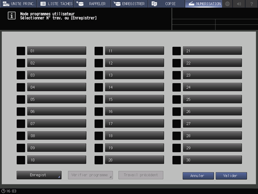 Appuyez sur [Valider] pour revenir à l'écran [Mode programmes utilisateur]. Le bouton de la tâche affiche le nome de tâche saisi.