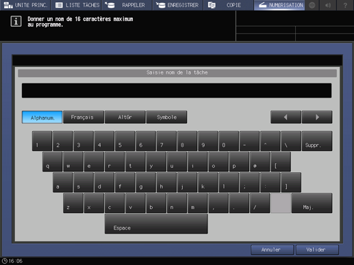 La saisie d'un nom de tâche est obligatoire. Le nom de tâche doit être entré pour revenir à l'écran [Mode programmes utilisateur] en appuyant sur [Valider].