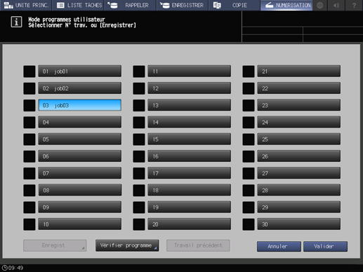 Pour afficher l'écran [Mode programmes utilisateur], affichez l'écran [NUMERISER] et appuyez sur Programmes sur le panneau de contrôle. Lorsque l'écran [MACHINE] ou un autre écran est affiché, l'écran [Mode programmes utilisateur] n'est pas affiché.