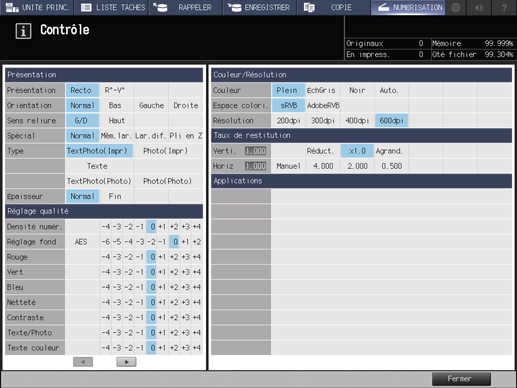 Les paramètres actuels de Présentation, Réglage qualité et Format numérisation du côté gauche de l'écran [Contrôle].