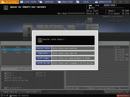 Pour poursuivre les tâches, actionnez l'interrupteur secondaire afin d'afficher l'écran [MACHINE] et appuyez sur la bouton Départ du panneau de contrôle.
