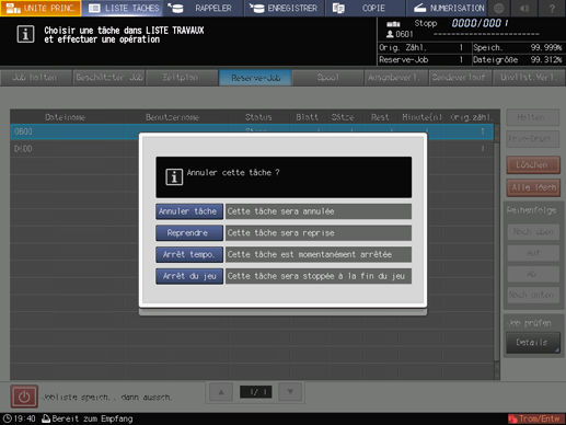 Pour annuler la poursuite de la tâche le lendemain, appuyez sur [Non]. L'écran [LISTE TRAVAUX] réapparaît.