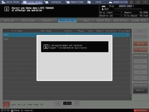 Appuyez sur [EnregListeTravail puis extinct] dans le coin inférieur gauche de l'écran.