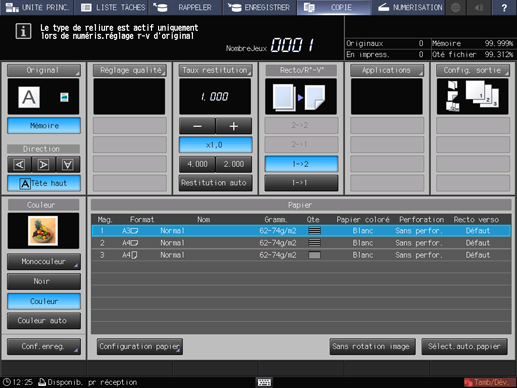 Le réglage de la machine adapte automatiquement le [Type de reliure] de [Réglage sortie] des copies à celui de l'original.