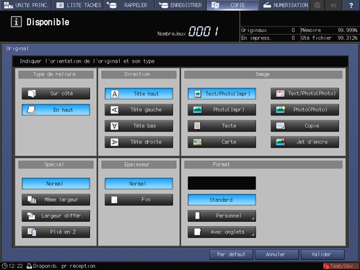 Sélectionnez un bouton de [Direction] figurant sous [Original] en fonction de l'orientation réelle de l'original.