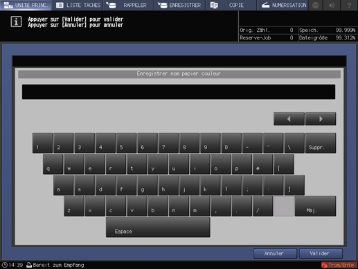 Pour changer le nom de couleur spécifié, appuyez sur [Saisie nom couleur] pour afficher l'écran [Saisie nom du papier coloré] et renommez-la.