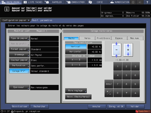 Si vous modifiez les réglages de [Taux restitution] de [Recto] ou [Verso], [Décalage de l'image], [Pivot/biais] et [Mire réglage] ou si vous effectuez le réglage [Espace] ou [Mes.num.], l'indication de [Calage R°V°] sur l'écran [Modif. paramètres] devient [Valeur modifiée].