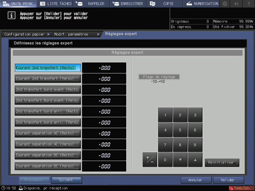 Pour [Boucle synchro (Verso)] qui s'affiche en appuyant sur [Suivant] deux fois depuis [Courant 2d transfert (Recto)], sélectionnez le bouton de l'élément que vous souhaitez régler et appuyez sur le clavier de l'écran tactile, [], [