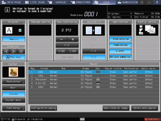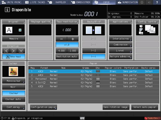 Un maximum de 4 raccourcis des éléments de réglage fréquemment utilisés peuvent être affichés sous l'onglet [Applications] de l'écran [COPIER]. Ces touches permettent de définir la fonction application en un clic ou de passer directement à l'écran de réglage correspondant. Vous pouvez effectuer le réglage des touches de raccourci dans le [Réglage utilisateur] du menu Utilitaires.