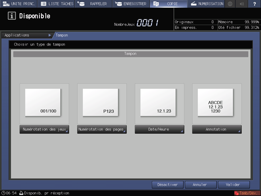 L'icône [Tampon] et la touche de raccourci sont affichées sous l'onglet [Applications] de l'écran [COPIER].
