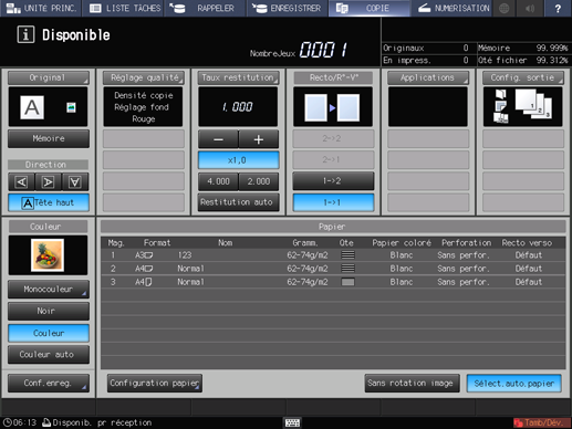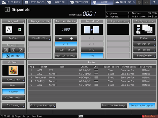 Un maximum de 4 raccourcis de réglages de sortie fréquemment utilisés peuvent être affichés sous l'onglet [Réglage sortie] de l'écran [COPIER]. Ces touches permettent de définir la fonction sortie en un clic ou de passer directement à l'écran de réglage correspondant. Vous pouvez effectuer le réglage des touches de raccourci dans la [configuration utilisateur] du menu Utilitaires.