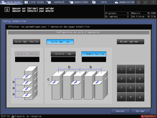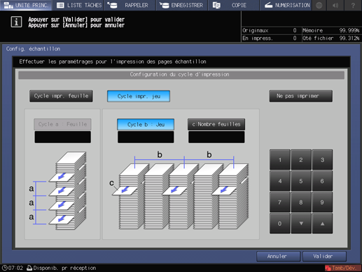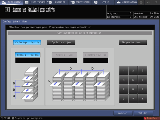 Définissez une impression test en sélectionnant [Cycle impr. feuille] pour sortir un échantillon chaque fois que le nombre der feuilles spécifié est atteint ou [Cycle impr. jeu] pour sortir un échantillon à chaque nombre de jeux spécifié.
