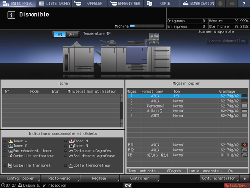 La machine commence la tâche à imprimer et envoie automatiquement une impression test vers le magasin secondaire de l'option de finition dans le cycle spécifié.