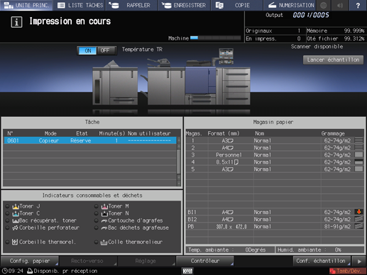 Vous pouvez modifier l'ordre des tâches en impression ou annuler des tâches réservées sur l'écran [LISTE TRAVAUX]. Pour en savoir plus, voir Présentation de l'écran LISTE TRAVAUX.