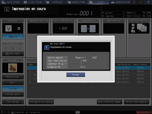 Si vous définissez l'écran [COPIER] dans [Écran par défaut],seul [Fermer] est affiché dans le dialogue. Pour revenir à l'écran [COPIER], appuyez sur [Fermer].