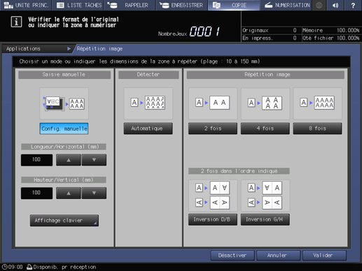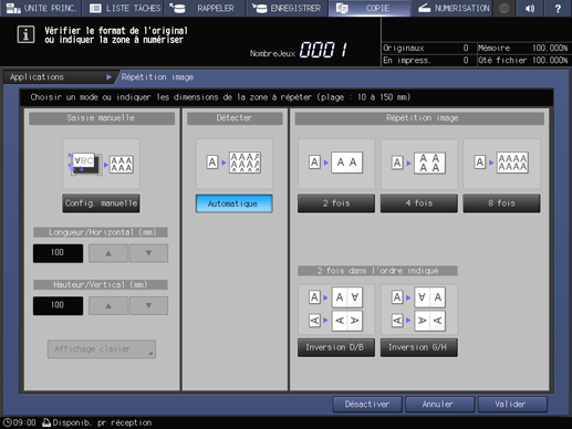 Cette fonction copie de manière répétée l'original numérisé sur papier, autant de fois que possible. Le format original peut être spécifié manuellement ou détecté automatiquement.