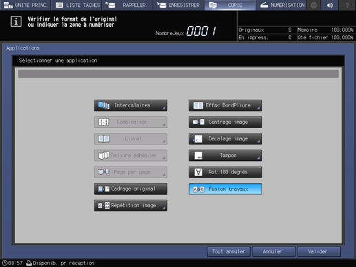 L'icône [Fusion travaux] et le raccourci sont affichés sous l'onglet [Applications] de l'écran [COPIE]. De même, la [Mémoire] est sélectionnée automatiquement.