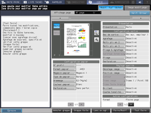 Pour modifier les conditions de copie après la fusion de toutes les tâches, appuyez sur [Faire/Modif.] pour afficher l'écran [Modif. fus° tâches] comme sur l'illustration ci-dessous. Une fois les modifications terminées, appuyez sur [Tout faire].