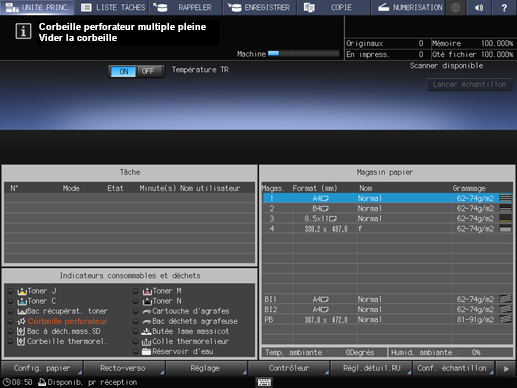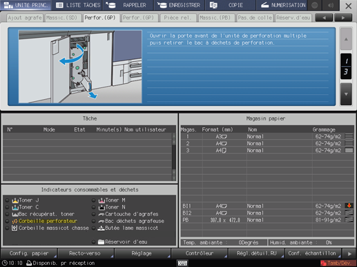 Appuyez sur l'indicateur de la corbeille perforateur dans la zone des indicateurs des consommables et des déchets de l'écran [MACHINE].