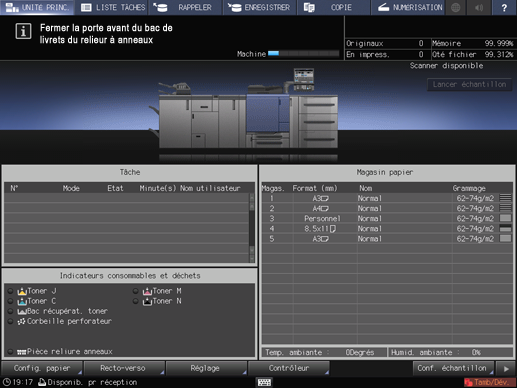 Si le bac Livret n'est pas remis en place correctement, le message [Fermer la porte avant du bac Livret du relieur à anneaux] s'affiche dans la zone de message de l'écran.