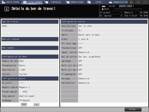 Vérifiez les informations concernant l'impression, l'arrêt et les travaux en réserve dans la liste à l'écran.