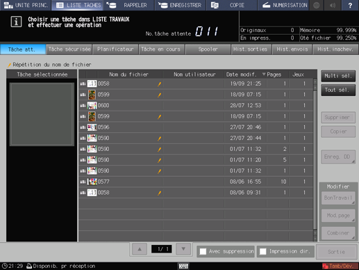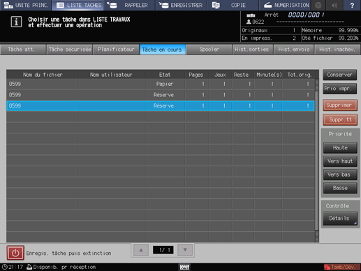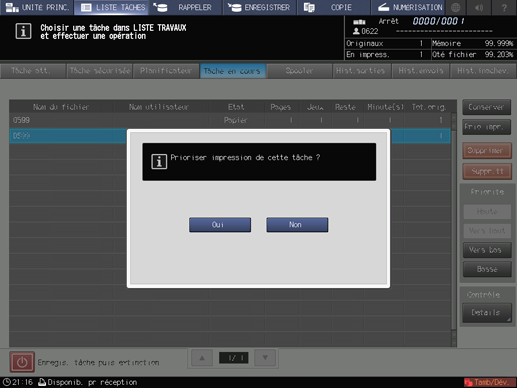 Pour effectuer une impression prioritaire, sélectionnez la tâche à imprimer avant la tâche en cours, puis appuyez sur [Prio impr.]. Appuyez sur [Oui] dans le dialogue.