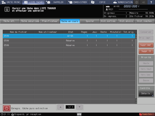 La mise en attente des tâches réservées est aussi disponible sur l'écran [Tâche en cours]. Voir Contrôle et opérations de tâches en cours pour en savoir plus.