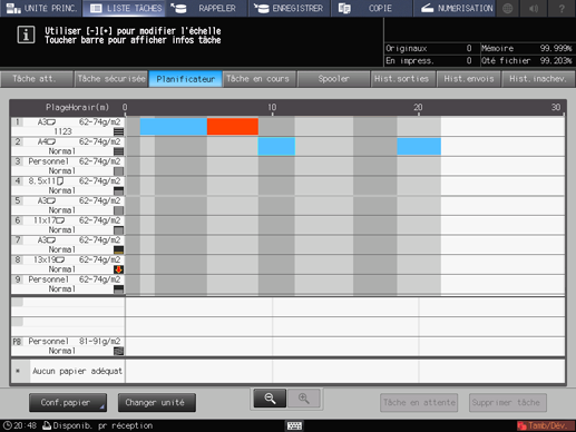 Vous ne pouvez pas quitter l'écran [Planificateur] si le dialogue opération ou réglage papier est affiché. Pour quitter l'écran [Planificateur], appuyez sur [x] dans le coin supérieur droit du dialogue afin de le refermer.