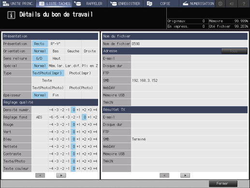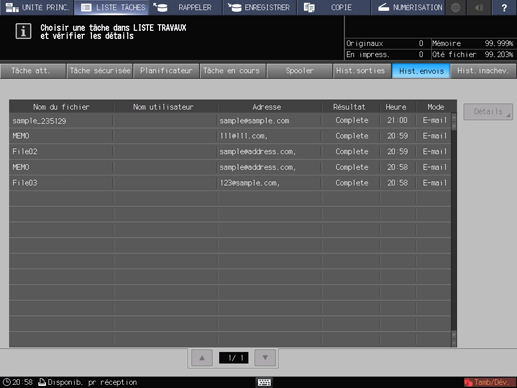 Un total de 100 tâches peuvent être affichées dans [Hist.sorties], [Hist.envois] et [Hist.inachev.]. Lorsque le contrôleur d'image IC-603 est monté sur la machine, les tâches sont conservées, même si la machine est éteinte.