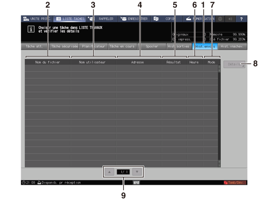 9 | Touches de défilement | Permet de faire défiler la liste de l'historique d'envoi. Le nombre total de pages et le numéro de page actuelle de la liste historique envois sont affichés entre les touches. |
