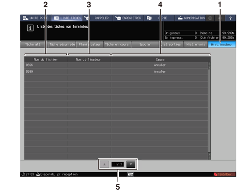 Un total de 100 tâches peuvent être affichées dans [Hist.sorties], [Hist.envois] et [Hist.inachev.]. Lorsque le contrôleur d'image IC-603 est monté sur la machine, les tâches sont conservées, même si la machine est éteinte.