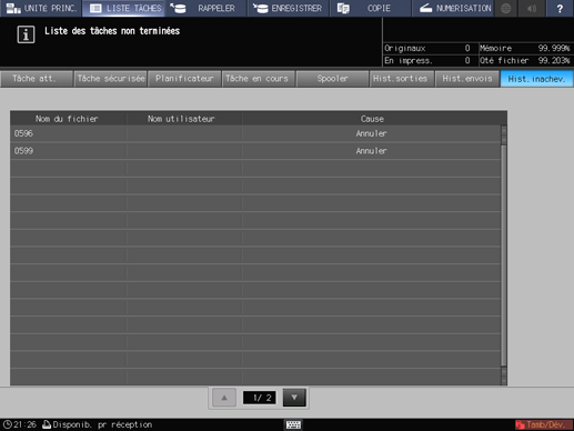 Appuyez sur [LISTE TÂCHES], puis sur [Hist.inachev.].