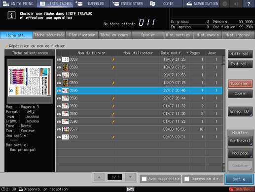 Vous pouvez imprimer, modifier le bon de travail et la page ou copier une tâche en attente. De même, vous pouvez l'enregistrer en tant que tâche en tant que tâche enregistrée sur disque dur.