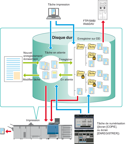 Vous pouvez enregistrer les données numérisées avec la machine (tâche numérisée sur l'écran [COPIER] et sur l'écran [ENREGISTRER] ainsi qu'une tâche d'impression d'un ordinateur en tant que tâche en attente ou tâche enregistrée sur disque dur.