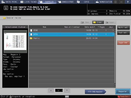 Vous pouvez imprimer un travail enregistré sur le disque dur et l'envoyer à un ordinateur du réseau. De même, vous pouvez le rappeler en tâche en attente.