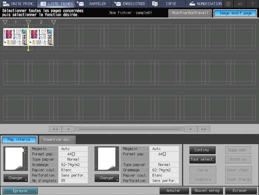 Modification Page Image | Affiche les images d'aperçu de la séquence de pages. Cette fonction vous permet aussi d'insérer, déplacer, ou copie les images ou feuilles (couvertures). |