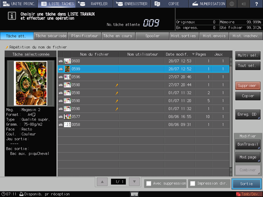 Appuyez sur l'onglet [LISTE TRAVAUX] pour afficher l'écran [LISTE TRAVAUX].
