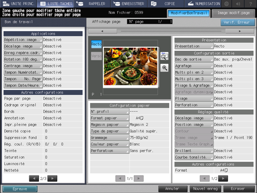 Pressez [Epreuve] pour sortir et vérifier le réglage modifié. Vous pouvez spécifier un jeu, une feuille dans l'aperçu ou une feuille comme sortie.